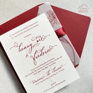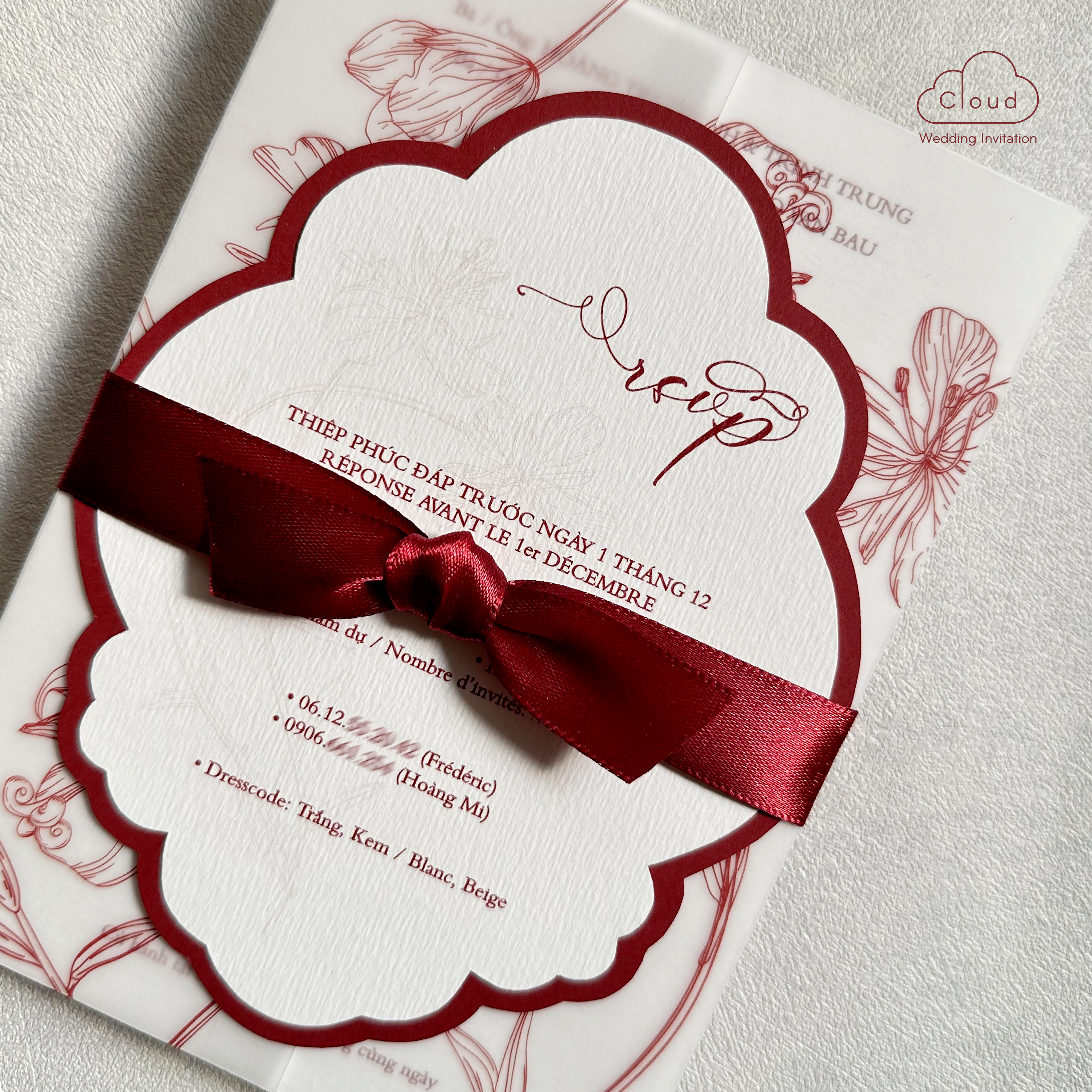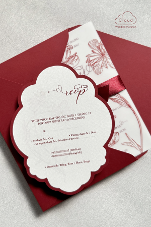 * Mặt trước nội dung thiệp mời: 11 x 14 cm, quy cách in 1 mặt, bế theo khuôn mẫu, chất liệu giấy mỹ thuật cao cấp.