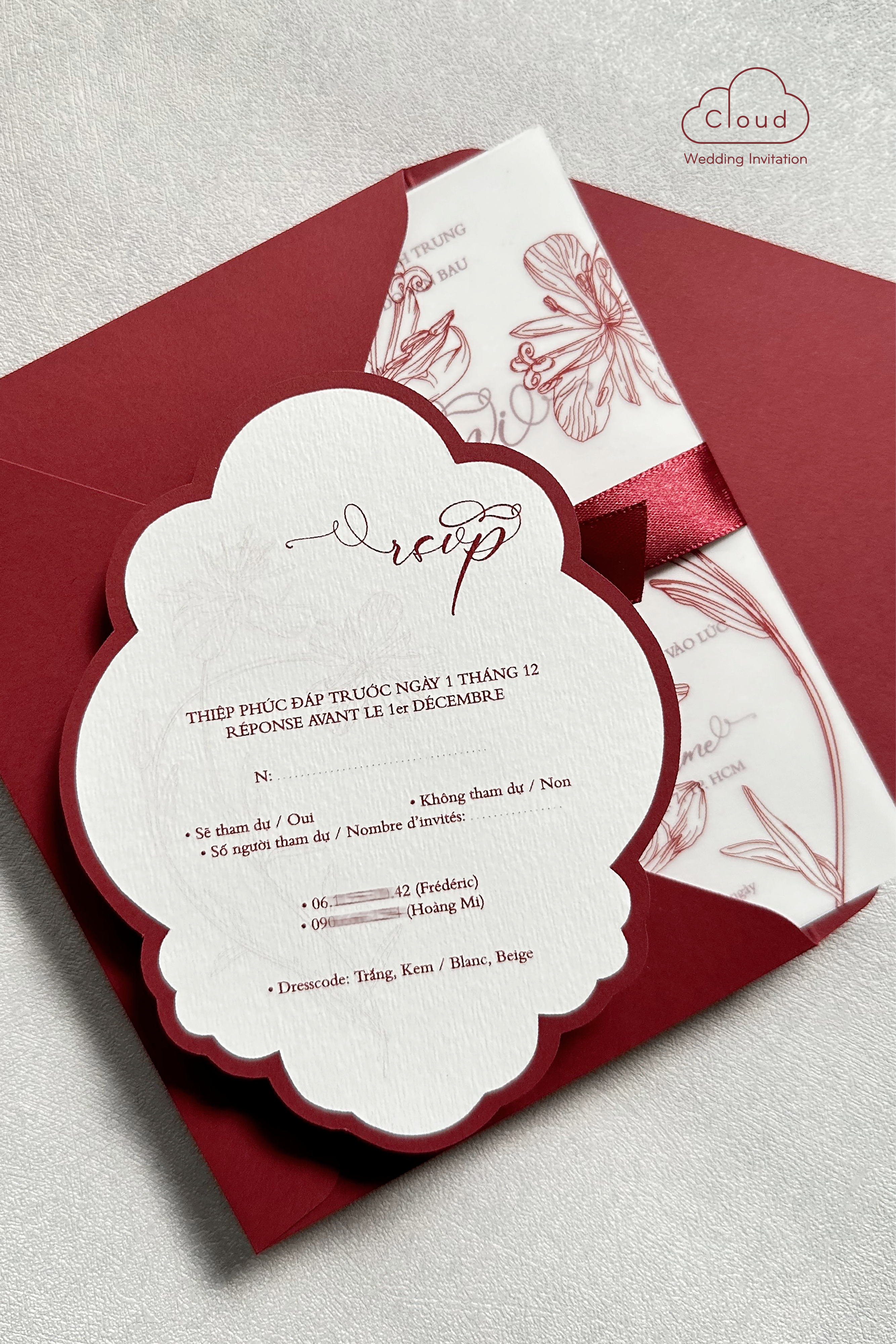 * Tờ dán lót thiệp mời: 12 x 15 cm, quy cách in 1 mặt, bế theo khuôn mẫu, chất liệu giấy mỹ thuật cao cấp.