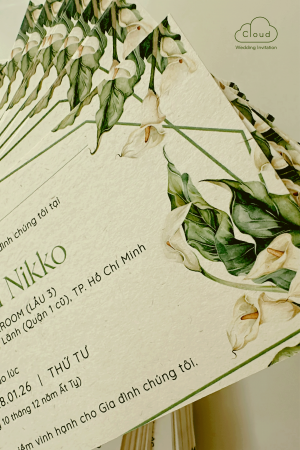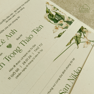 – Thiệp mời: 8 x 18 cm, quy cách in 2 mặt, gắn rời lên Folder thiệp, chất liệu giấy mỹ thuật cao cấp.